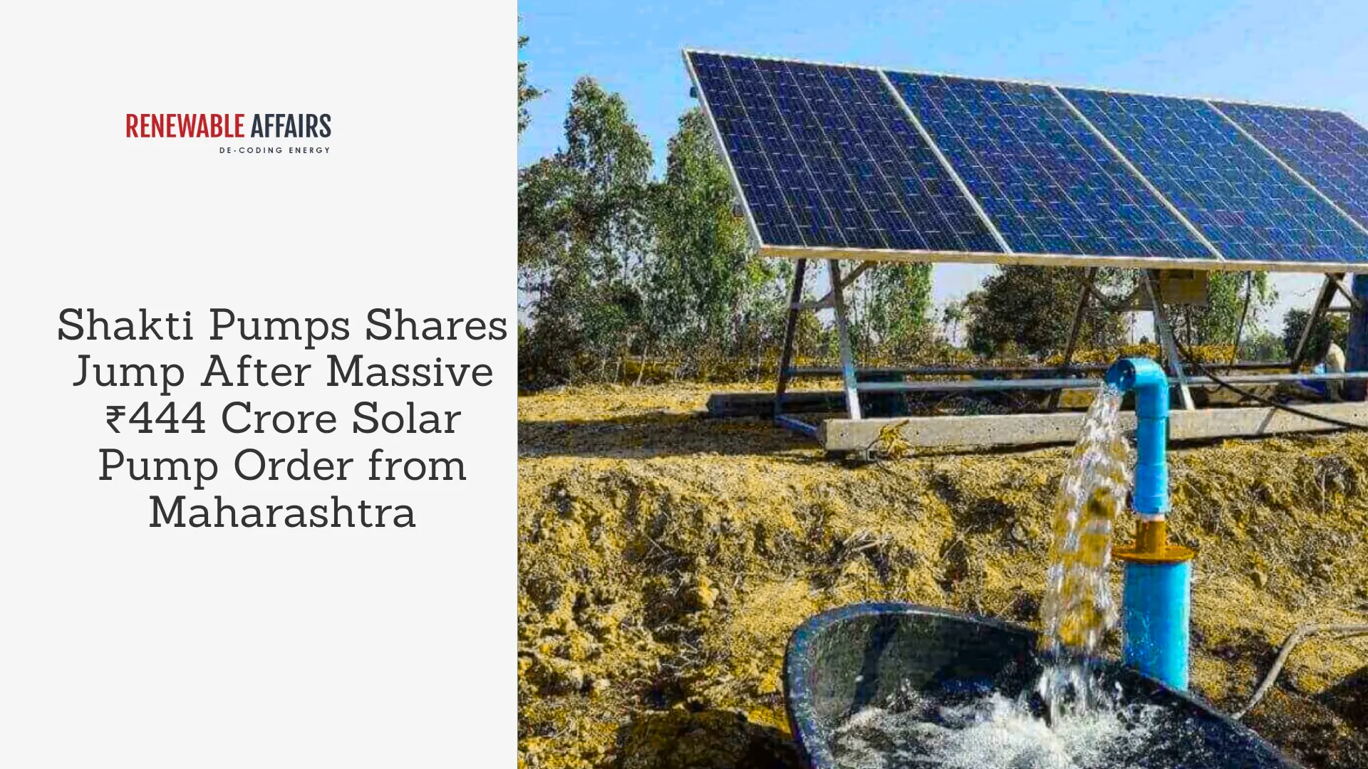 Shakti Pumps’ stock jumped more than 13% on Thursday after the company announced a major new order from theMaharashtra State Electricity Distribution Company (MSEDCL).